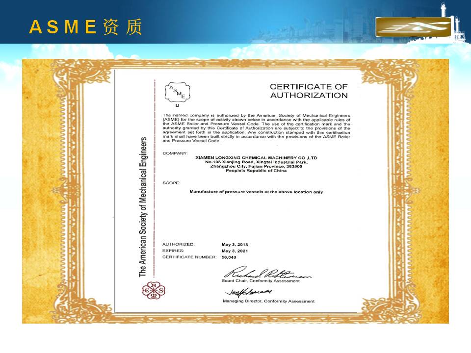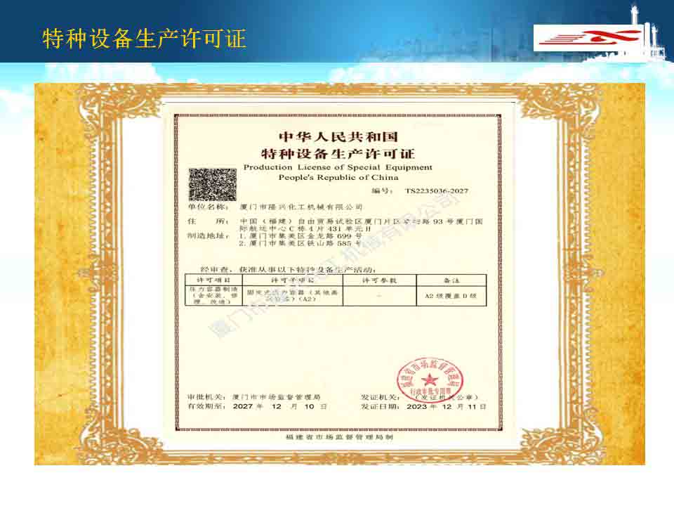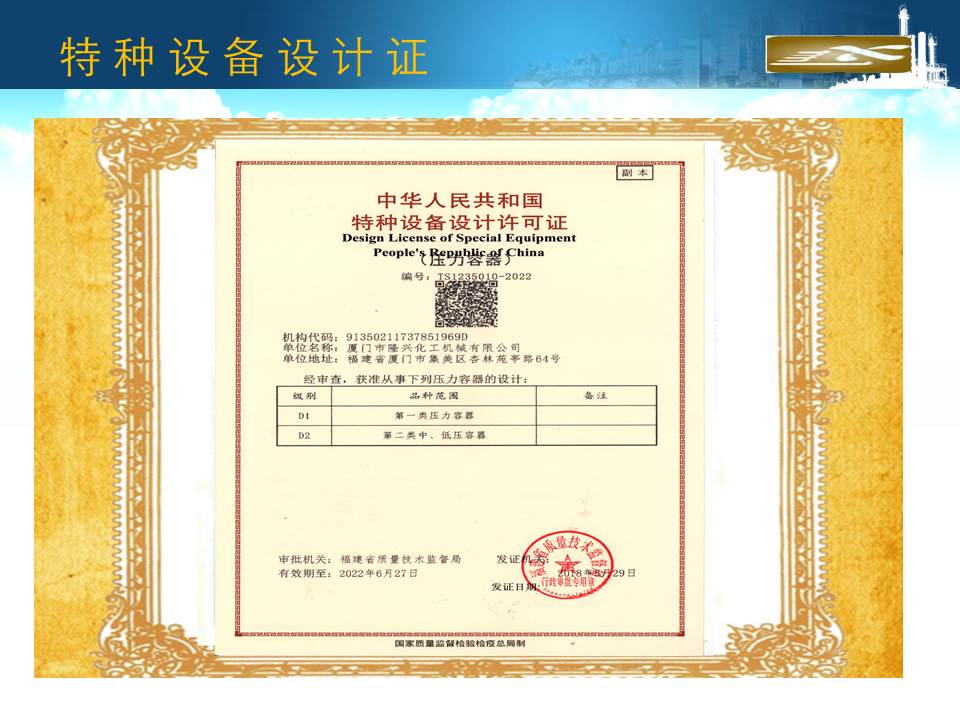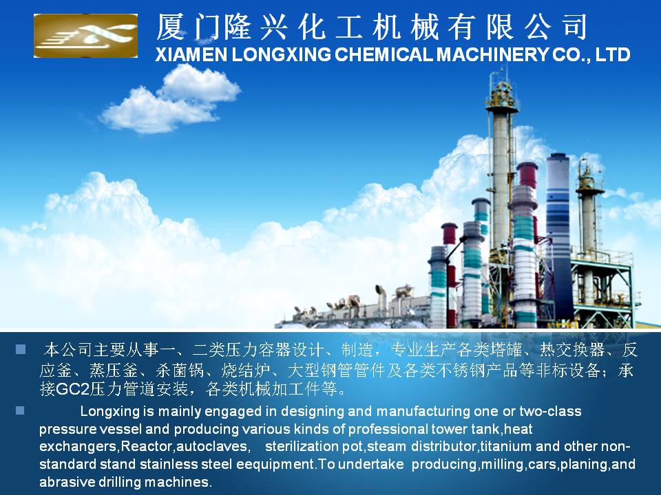 廈門隆興化工機械有限公司成立于2001年5月,占地面積30000平方米,擁有生產車間面積10000平方米及相關配套的辦公場所3000平方米,其中下料場所1000平方米,不銹鋼制作場所2000平方米,ASME產品制作區(qū)域1200平方米,無損曝光室30平方米。公司有職工135人,擁有專業(yè)的技術人員和管理人員36人。公司主要從事設計、制造A2級覆蓋D類壓力容器...